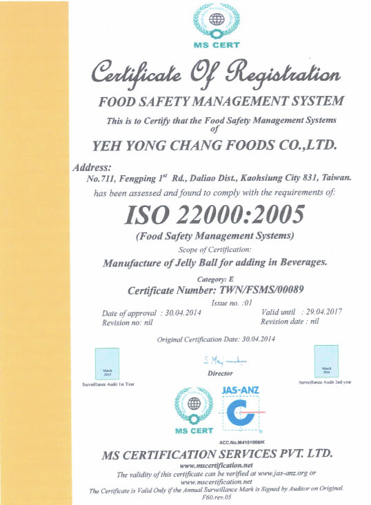 葉永昌食品有限公司為提供更優質的服務及更安心的食品給熱愛珍珠奶茶與的顧客,品質信念提倡主要以安全,健康,衛生, 本公司已通過ISO22000/HACCP/FDA國際認證,讓懂茶的您,買的安心喝得更放心。
